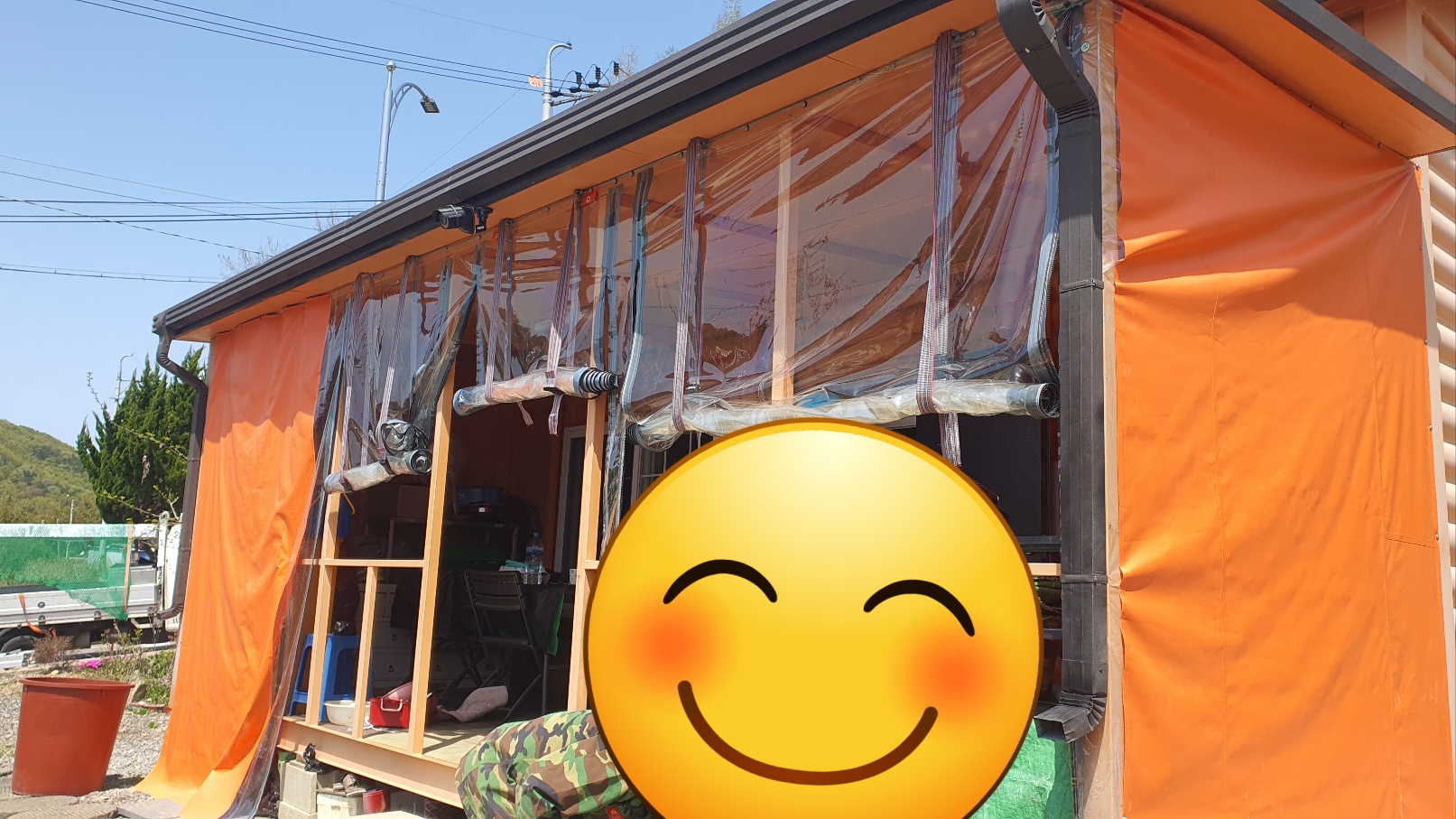 전남 화순 농막 방풍막 앞면 3곳 지퍼 오픈형 방풍,차양,공기순환 우수함